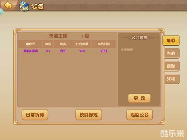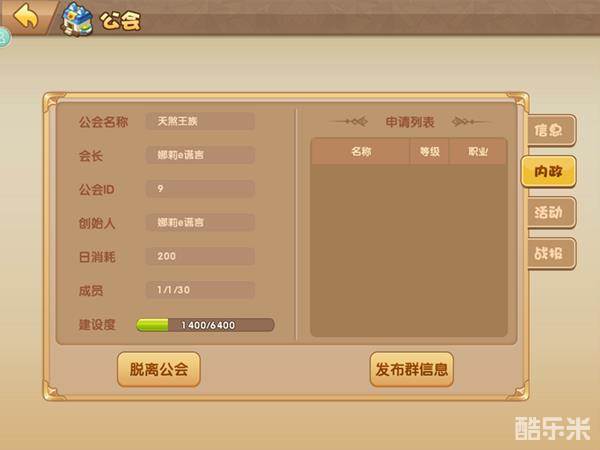 第二个页面是内政,这个页面可以查看公会本身的信息,包括公会名称,公会ID,会长,几个成员,建设度。拥有职务的玩家还可以在这个页面通过玩家的申请,想脱离公会的玩家也可以在这个页面脱离。
