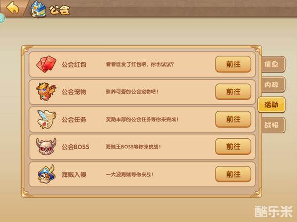 第三个页面是一些公会的活动,公会红包,公会boss,公会宠物等任务都是可以直接从这个页面前往。