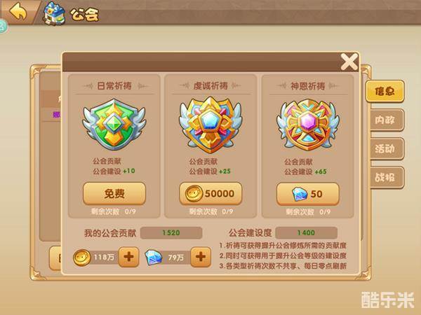 公会还有一点就是贡献,既然是个大家庭大家就都要出一份力,在第一个页面左下角有个日常祈祷,里面有3种祈祷方式,日常祈祷,虔诚祈祷,神恩祈祷,每种都可以祈祷9次,日常祈祷不用任何东西,虔诚祈祷每次需要5万金币,神恩祈祷则每次需要50钻石,基本每天都要日常祈祷以及虔诚祈祷。祈祷可以换来公会贡献,公会不会让你吃亏的,贡献可以用来提升自己。