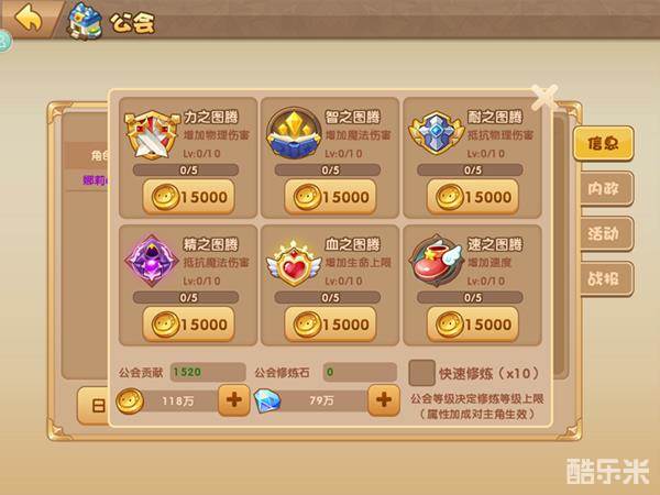 贡献可以在第一个页面的中间技能修炼页面上使用,修炼公会技能需要金币以及公会贡献。