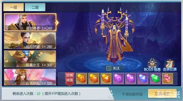 这里的BOSS不同于其他的BOSS,每击杀一个BOSS会增加相应的怒气值,每个BOSS的怒气值显示在血条下方,当上仙怒气值达到100,倒计时30s后会强制离开副本。