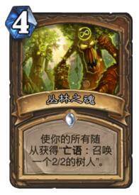 这张卡在超生德卡组中的强度是很高的,常见的combo就是8费小精灵+丛林之魂赖场,除了战路、亵渎和传播年瘟疫还没怕过谁,一般对手解不掉的情况下,如果手中有咆哮或者分岔路口,分分钟就是20+的斩杀伤害,即便解掉了,对手节奏也卡了,我们也还有下一波铺场的机会;另外还有传播瘟疫加丛林之魂的combo也很强力,不解过不来,解了场攻还变高;而这一切都归功于丛林之魂。
