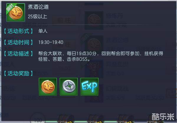 煮酒论道是《魔剑侠缘》手游中的帮会限时活动玩法,场景发生在帮会中,限单人进入,每天19:30——19:40开启。完成“煮酒论道”任务,可以增加15日活跃度。