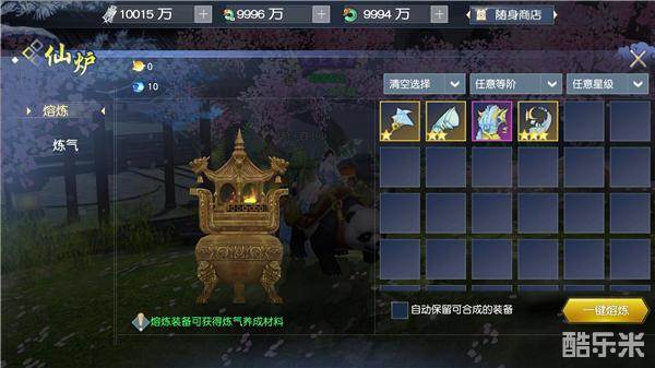仙炉熔炼:将不需要的装备交由仙炉熔炼,能获得丹晶和灵气,这两者是炼气的主要材料
