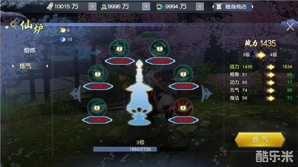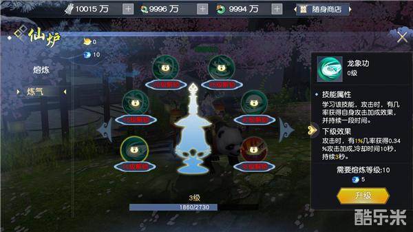 仙炉炼气:熔炼获得的丹晶可提升仙炉等级,获得属性;灵气则用于解锁和升级仙炉的被动技能