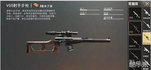 VSS这把枪算是刺激战场中比较奇葩的一把抢了,它是唯一一把使用9毫米子弹的射手步枪,唯一一把自带四倍镜的枪械,能够使用全自动模式的射手步枪,总之非常有特点。这把枪虽然很少有人用,但是在前期没有倍镜的情况下,捡到这把枪还是非常有优势的。因为有全自动,在单发狙模式非常厉害。