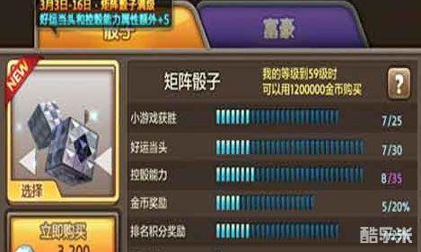 去掉活动限时属性,“矩阵骰子”属性为:小游戏获胜25点、好运当头25点、控骰能力30点、金币奖励20%%、排名积分奖励25%%、单双奖励1次,相对精品骰子来说,同时加成了金币和排名积分两项,尤其排名积分加成更达到了25点,是目前所有骰子中最高的。但相对精品骰子来说,多了小游戏获胜,但删掉了实用性的建设、收购双打折,具体怎么抉择还是要看玩家自己了。