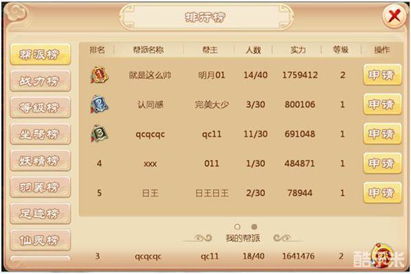 1. 帮派榜:帮派的排行,等级越高,实力越强,排行越高;