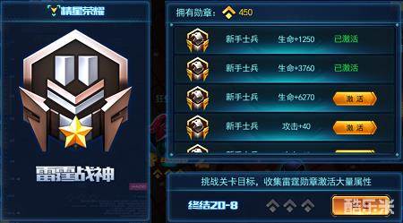 刷三星只为扫荡?简直弱爆了!枪雨再给你一个刷三星的理由!关卡过关后会按照通过星级给予勋章,通过获得的勋章,可以在精星荣耀页面来兑换大量的属性!让你属性疯长!羡煞旁人!