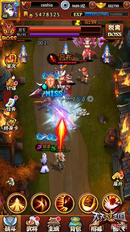 张飞,作为三国时期的蜀汉名将,其特有的技能“旋风斩”,可让手中的长矛在挥舞时划出一道道金黄色的晕圈;黄忠,刘备手下的得力干将,其特有的技能“冰霜射击”,可让手中的宝弓在射击时散发出冰蓝色的光影。吕布的“方天画戟”、关羽的“武神斩”等等,每一位武将在释放技能技能时都可散发出满屏的炫目效果,带来更加震撼的视觉体验。