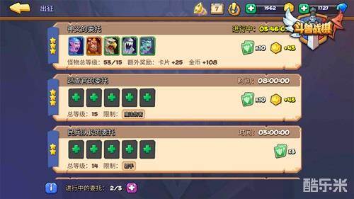 当领主们在《斗兽战棋》中解锁「出征」玩法后,即可派遣拥有的怪兽们组建队伍、执行任务。今日《斗兽战棋》更新后,「出征」的收益将有大幅度提升,领主们在经过3小时或8小时的等待时间后,会收获数量更多的卡牌碎片与金币,让培养怪兽变得更加轻松!