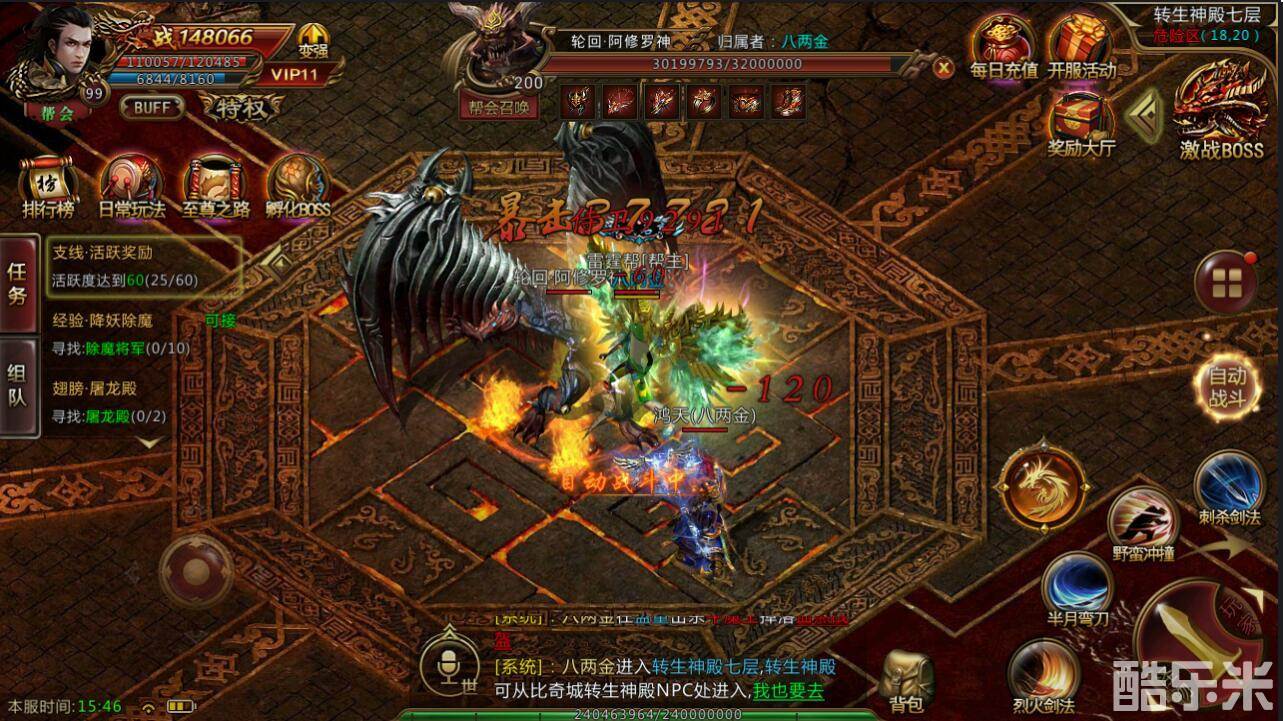 在继承端游玩法的同时,《雷霆霸业》还针对手机平台把内容做了优化。游戏内的菜单均可以从主界面呼出,游戏核心的刷BOSS菜单被移至画面右上角,点击想刷的BOSS便可直接跳转到其栖息处展开杀戮。角色的招式按钮也都归类到右下角,在降低了战斗操作门槛的同时,还大幅提升了战斗的爽快感。