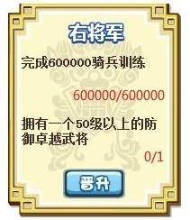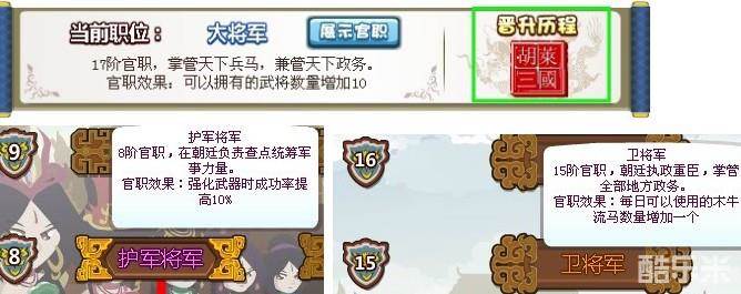4)部分官职的晋升条件比较难理解,比如右将军需要防御卓越旧将领 如:黄忠、陆逊、曹仁;这是由于官职系统是在真将出现之前定制的,故需要旧将才可以完成,其他官职以此类推。