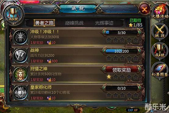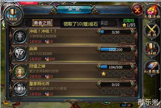 “勇者之路”的成就达成难度较低,比如之前提到的“狩猎之神”就是“勇者之路”分支下的成就之一。“勇者之路”下的每个成就都分为五个阶段,每完成1个阶段,该成就就点亮1星,同时进度条也会变成领取奖励按钮,点击它可以使你获得成就中所描述的该星成就奖励:比如图中的狩猎之神1星奖励就是10点绑定魔石。