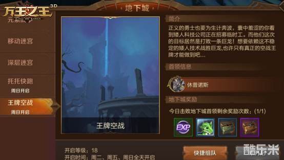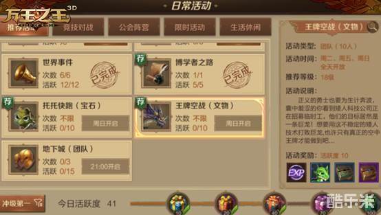 王牌空战活动是《万王之王3D》日常活动中的文物活动,玩家将化身为矮人科技的临时工与巨龙“修普诺斯”大战。活动将在玩家18级时开启,活动时间为周二、周五、周日全天开放,玩家可以10人团队作战。王牌空战活动没有次数限制,而且玩法趣味性十足,如果玩家朋友们处于无任务、无体力的空窗期,