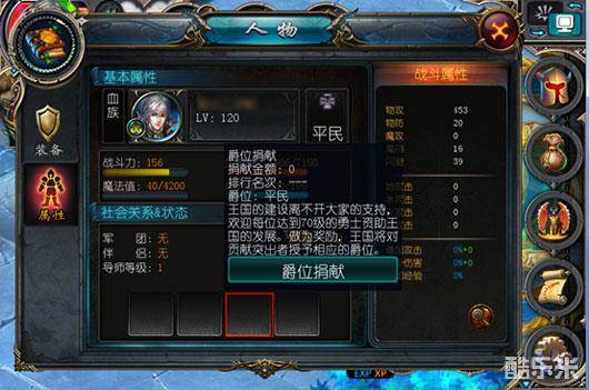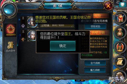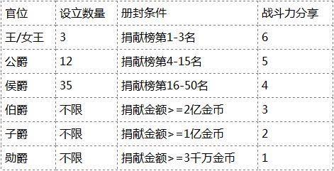 王国将根据玩家的经济实力,并对在困难时期大公无私,慷慨解囊资助王国,对王国做出卓越贡献的玩家加官进爵,资助排行前50名的玩家将得到王、公爵、侯爵的爵位分配,每个爵位的人数设立有限。而50名外没有爵位的玩家可根据伯、子、勋爵的册封条件,进行爵位分配,只要达到该爵位册封条件即可被册封,人数不限。一旦获得爵位册封,不但能受到众人的仰慕,而且能得到相应的战斗力加成哦!爵位系统共分为6级,每级可增加不同的战斗力。
