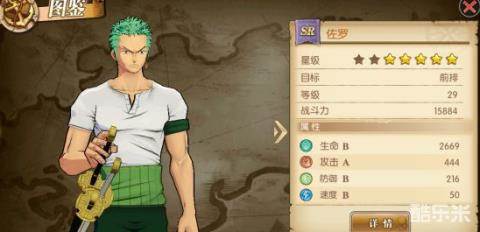 佐罗,一位标准的前排角色,品级为SR、五颗星,攻击成长值为A,其他生命、防御和速度为B,也就是说:佐罗爆发强势,但保命能力一般。