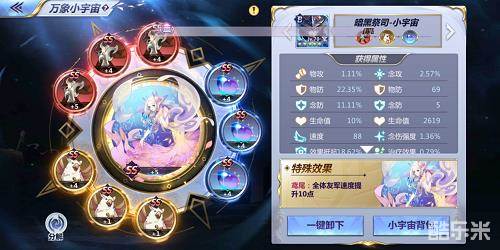 暗黑祭司最需要的就是速度方面的支持,需要抢先在敌方出手前对敌人进行沉默这个软控制,因此小宇宙整体选择倾向于速度方面的加成。暗黑祭司的软控特性会让敌方进行集火打击,因此防杖与坚韧的配备会让暗黑祭司生存能力得以保障。