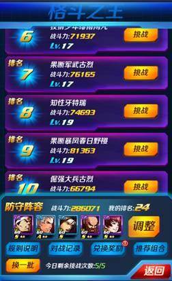 与全服玩家竞技,角逐最强格斗之王的宝座,玩家等级达到10级即可参加格斗之王大赛,玩家通过战胜对手,即可取代对手在格斗之王大赛中的排位,当然,其他玩家也可以战胜并取代自己,请务必小心,每个玩家每天的参赛次数有限,参赛次数可通过花费钻石进行重置,玩家每天的重置次数有限,提升VIP等级可增加重置次数上限,玩家每次挑战对手后,会进入挑战准备状态,在这个状态下不能继续挑战别人玩家可通过花费钻石迅速结束挑战准备状态,达到个人历史最高排名时,将获得丰厚的奖励,每天大赛主办方将会根据每个玩家的排名发放奖励