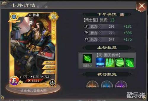 鲁肃的被动技能“好施”对于吴、蜀国来说也很友好。如果主动技能治疗目标是吴、蜀阵营,会按照鲁肃的26%基础策攻强化属性。若目标血量小于80%,强化物防;若目标武力>智力,强化物攻;若目标武力=智力,强化物攻;若目标武力<智力,则强化策攻。以上操作持续时间都是10秒哦!另外,被动技能“合众”还可以降低己方所有部队收到的物理技能伤害哦!是不是相当优秀了!