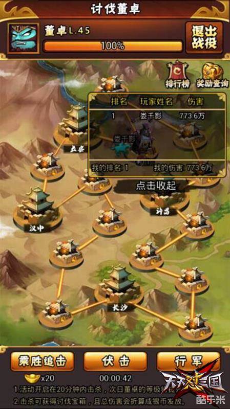 活动玩法:玩家进入活动后将随机出现在地图的据点上,需通过追击来到达大Boss董卓所在城池。其间可通过伏击攻打董卓来获得伤害统计,并在击杀冷却时,进行乘胜追击,增加伤害统计。当董卓的血量低于某个百分比时,将掉落礼包,额外获得突破石。