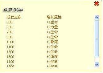 在成就页面的右上部有一个成就奖励的按钮,点击计入如下页面,这里说明了获得一定成就点后系统能够给自身的属性加成情况。