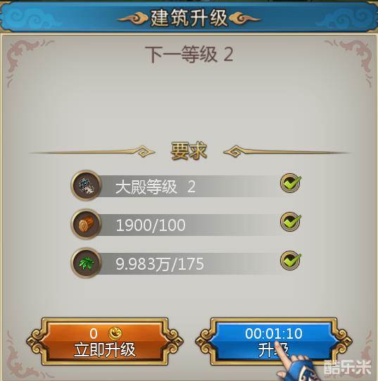 升级建筑:在免费时间内可以不消耗仙玉立即完成升级,正常升级时,正在升级的建筑会占用一个建造列表。建筑升级完成后会得到势力奖励。