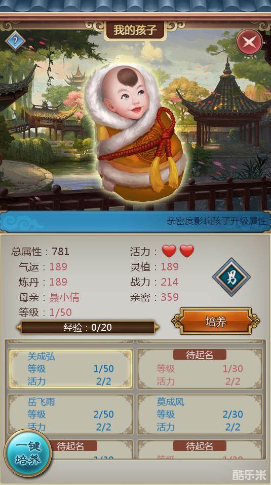 起名结束后就要开始培养了,孩子的灵根品质越高,可培养的次数也就越多,提高的属性也会更多。
