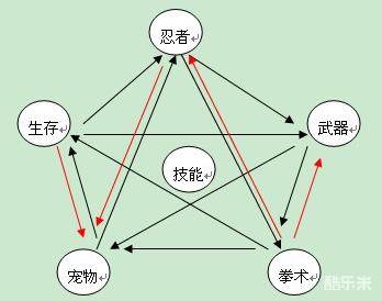 箭头方向表示克制方向,比如生存可以克制忍者 即 生存→忍者。