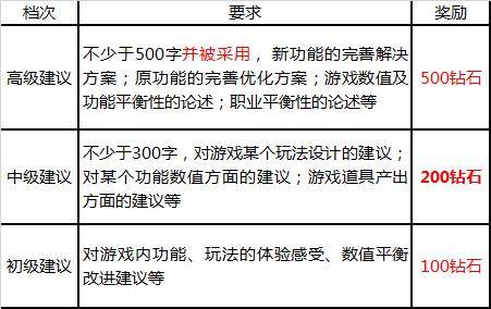 活动内容:通过指定渠道提交相应的游戏建议,专人评级后即可获得对应的奖励。你每一个惊艳的想法,我们都将拼命去实现!