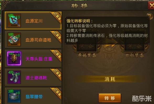 转移是可以将不用的装备上的强化等级,转移到更高等级的装备,转移需要消耗传承石。目标装备的强化等级必须为0。