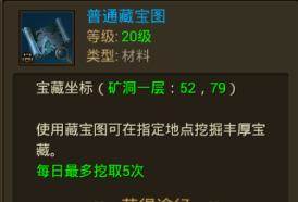藏宝图分普通藏宝图与黄金藏宝图两种。使用藏宝图可在指定地点挖掘丰富宝藏。