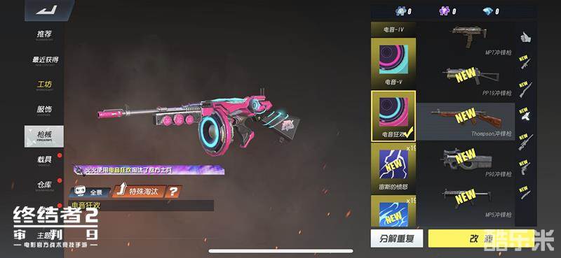 电音枪械涂装则是人气枪械Tompson的专属涂装,除了绝对抢眼的外观,电音涂装更拥有独特的电音枪火特效和专属淘汰播报,旁整个战场都听到你的战绩。电音涂装还可不断升级获得更酷炫的外观最高级的电音狂欢涂装更拥有特殊淘汰特性,击杀敌人后,对手的终结者核心外形将变成电音魔方外形!