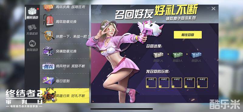 与此同时,《终结者2:审判日》也格外老朋友的归来,英雄的归来,定当非同凡响。活动期间,回归老玩家每天签到均可领取英雄归来专属奖励,彩钻、精英补给券、永久时装应有尽有;完成分享、参战、开黑等回归任务,获得回归积分,可开启回归奖励;每日活跃度达到30,还将获得丰厚的彩钻奖励。邀请老玩家回归的战士,也可获得相应的奖励。