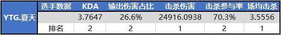YTG在第七周的比赛中与RNG.M鏖战五局,最终以3:2的比分战胜东部第二RNG.M,其中夏天的精彩发挥功不可没。RNG.M在BP当中频繁使用ban一抢一的方式,想要在为数不多的热门打野上限制夏天的英雄选择。但夏天灵活多变的英雄选择不仅帮助队伍成功化解对手首轮ban位,同时即便拿到相对输出环境较差难以发挥的英雄,同样打出了打野位选手中排名第二的输出占比,其个人实力可见一斑。