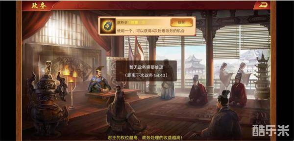 每60分钟可刷新4次处理政务的机会,也可以使用“政务令”获得处理政务的机会,获得更多的资源,助王上更加快速一统天下。