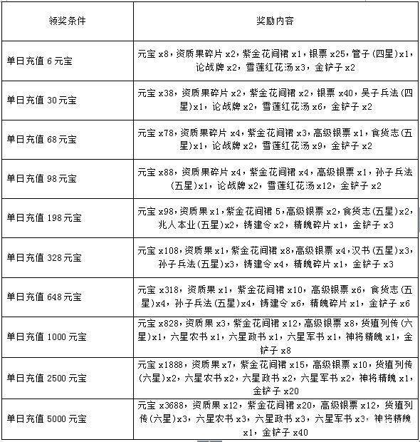 活动内容:活动期间,累计充值达到指定元宝数量即可领取奖励。