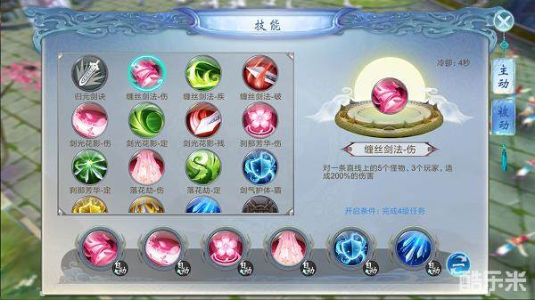 缠丝剑法-伤:完成4级任务解锁,冷却时间4秒。对一条直线上的5个怪物、3个玩家,造成200%的伤害。