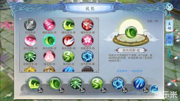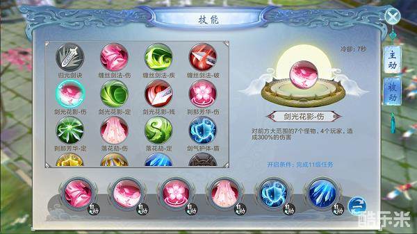 剑光花影-伤:完成11级任务解锁,冷却时间7秒。对前方大范围的7个怪物、4个玩家,造成300%的伤害。