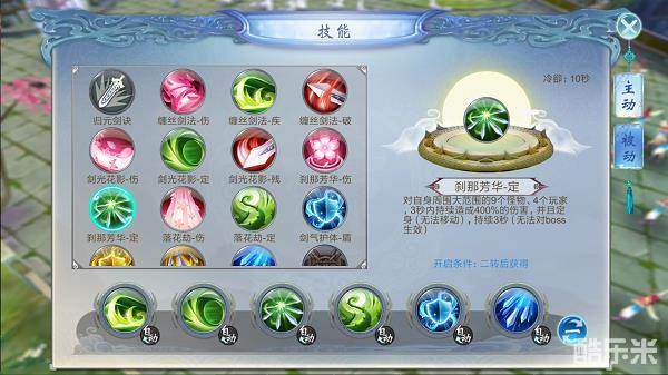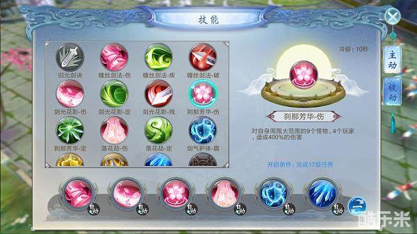 刹那芳华-伤:完成17级任务解锁,冷却时间10秒。对自身周围大范围的9个怪物、4个玩家,造成400%的伤害。
