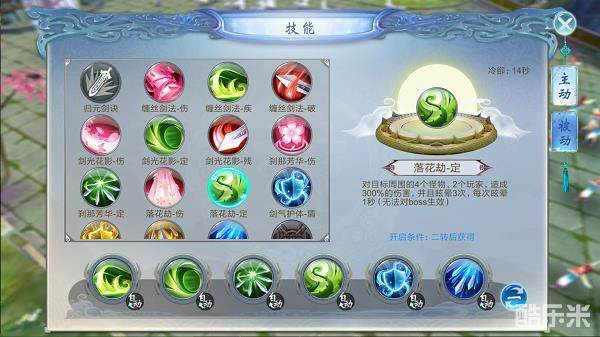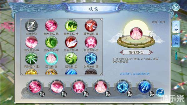 落花劫-伤:完成25级任务解锁,冷却时间14秒。对目标周围的4个怪物、2个玩家,造成500%的伤害。