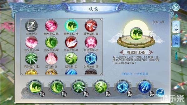 缠丝剑法-疾:完成一转后解锁,冷却时间4秒。对一条直线上的5个怪物、3个玩家,造成150%的伤害丙炔减速50%,维持3秒(无法对BOSS生效)