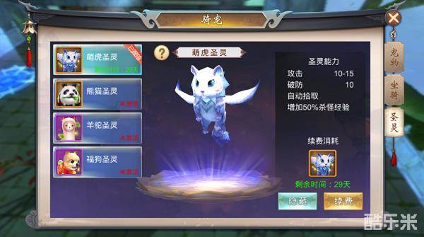 灵兽则是辅佐型,主要作用为自动捡装备、加成杀怪经验、角色属性的作用。