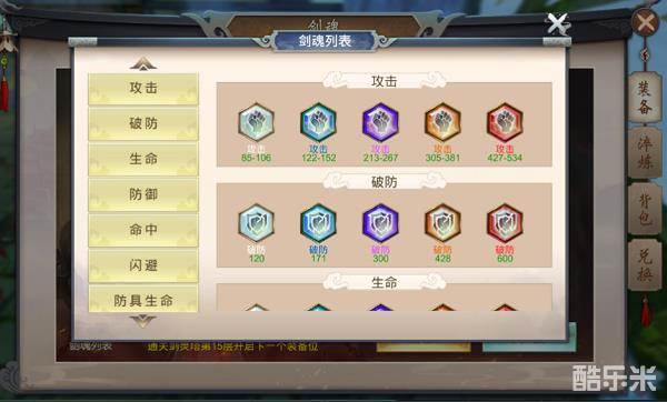 4、剑魂,简单来说是指符文,剑魂分很多种,如:攻击、破防、生命、防御、命中、闪避、武器攻击、武器破防、防具生命、防具防御、基础攻击等等,每种剑魂分5种品质(白、蓝、紫、橙、红)每种品质增加的属性上限各有不同,给游戏增加了更多的新元素。