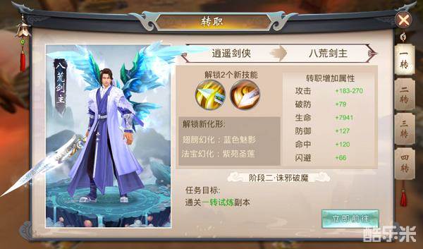 6、转职,转职目前分为四转,每次转职都需要特定等级,达到条件且完成任务后则完成转职,每转都会提升属性和新增技能,缺陷在于每次转职人物没有变化,如有变化则锦上添花。