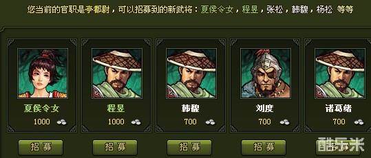 副将和武器一样。颜色高低依次是紫色>红色>黄色>绿色>白色,其中白色三围总和为50,绿色为150(质的飞跃),黄的围180,红的为210-220,紫的为240(目前在10万威望前的所有紫将都是这个标准),招募一个呗,肯定绿的,具体哪个无所谓,后面都会换。而且招募的副将自带装备,比如你招募黄的副将,就带一身黄色装备,红的就带红的装备,并且装备不能脱下,也不能更换,节省了很多要打造装备的麻烦。