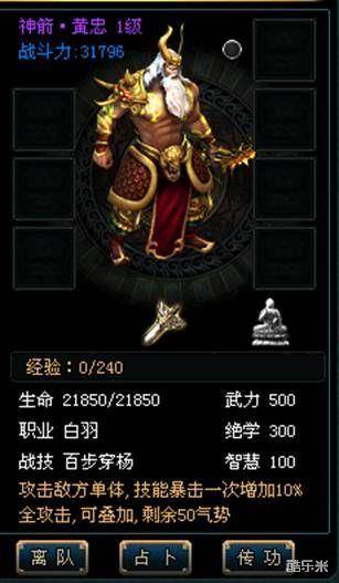 战能:百步穿杨,攻击敌方单体,技能暴击一次增加10%全体攻击,可叠加,剩余50士气