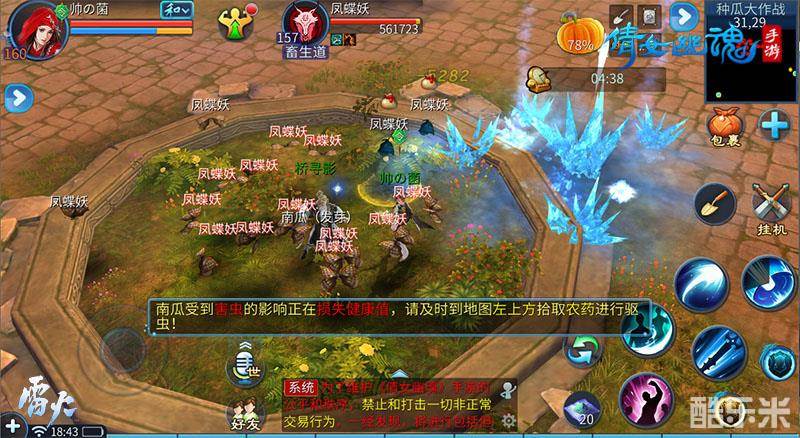 南瓜庄园中南瓜会自动发芽生长,并随时间不断成长直至成熟。而在此过程中,将有数波偷瓜怪物从各个方向袭来,玩家需要齐心协力保卫南瓜。除了怪物之外,南瓜成长期间还会遇到害虫、土壤板结、缺水缺肥等问题,损失其健康值。这时就需要玩家根据不同情况在地图上选择杀虫剂、农具、水壶或肥料道具,保障南瓜的成长。建议四人以上组队,合理分工,以求成功保护南瓜。