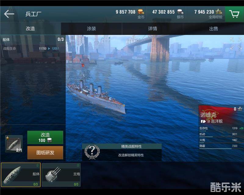 暂时不打算玩研发新战舰的,也可对现有战舰进行强化,强化渠道包括改装、学习舰长技能、搭载配件等等。改装是在兵工厂中对战舰的主炮、装甲的部件进行升级,获得更强的性能,改装完成的战舰还可升级为精英战舰,拥有独特的精英属性。舰长技能则是舰长等级提升后可学习的技能,最多可学习十个,可从速度、防空、火力等方面提升战舰性能;配件则是为鱼雷、损管、转向等战舰部件进行修改升级,以获得可观的属性加成。