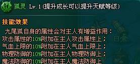 天赋1:狐灵(特有天赋) 可以让九尾狐自身的属性增加到人物身上